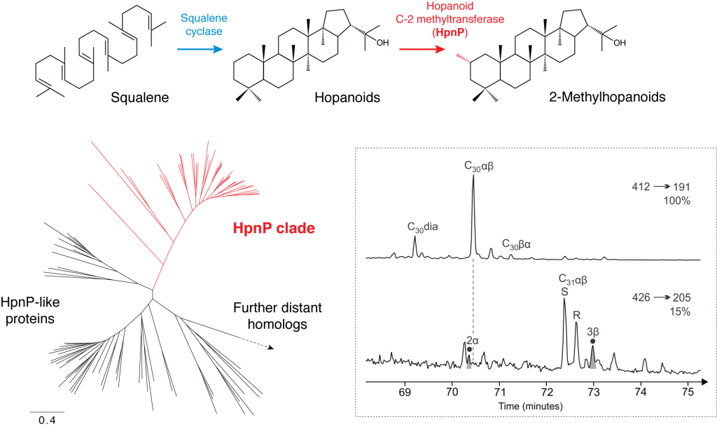 Fig. 2-Methylhopanoid biosynthesis by HpnP. In the geological record, 2-methylhopanoids are detected in the form of 2-methylhopanes (saturated forms of original compounds) as a result of diagenesis.