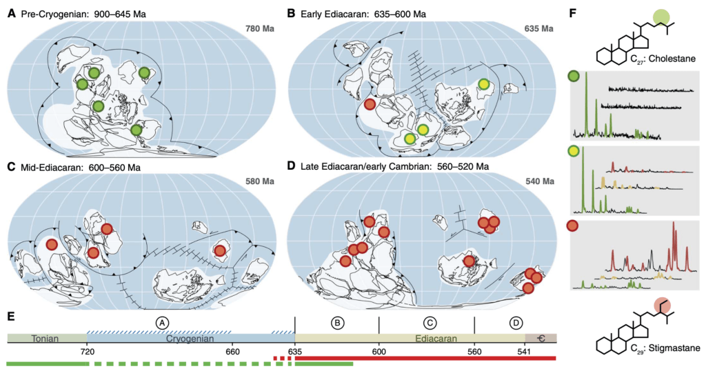 J. Brocks, A. Jarrett, E. Sirantoine, C. Hallmann, Y. Hoshino, T. Liyanage, 2017. The rise of algae in Cryogenian oceans and the emergence of animals, Nature, 548, 578-581. Link