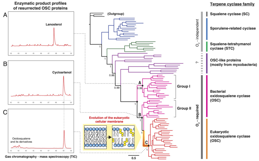 Fig. Phylogenetic tree of steroid-producing enzymes (oxidosqualene cyclase; OSC) and resurrection of ancestral OSC proteins (Nodes A, B & C).
