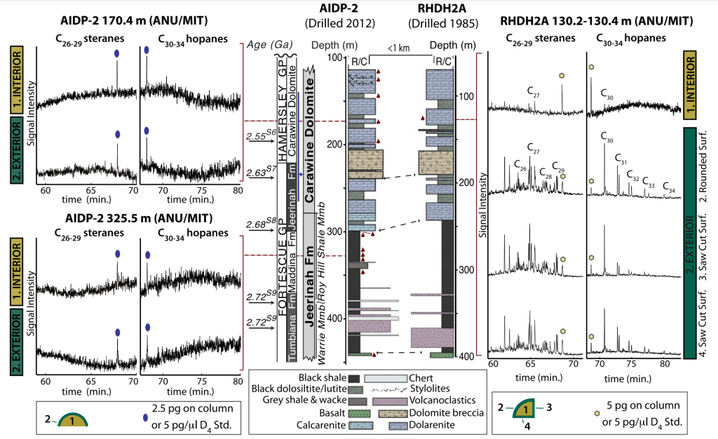 Fig. Non-contaminated Archean rock samples (left; AIDP-2) and previously-drilled contaminated Archean samples with substantial amounts of hopane and sterane biomarkers (right; RHDH2A).